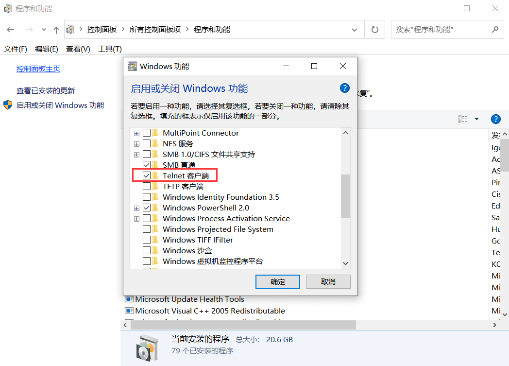 说明:默认情况下,windows 7和windows 10的telnet服务是关闭的,需要进行如下操作,自行打开才可以使用。