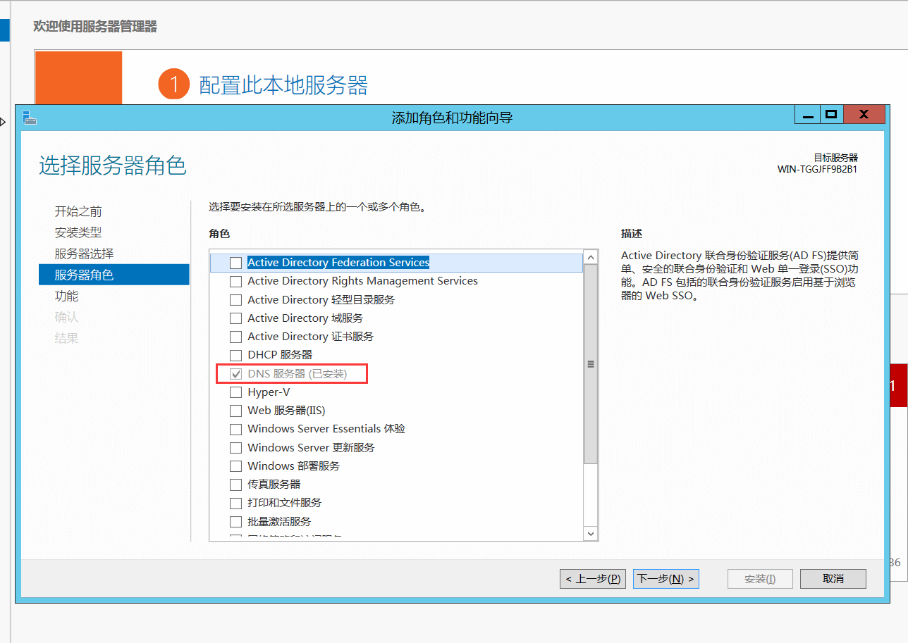 打开服务器管理器,添加角色和功能,一直点击下一步,直至选择服务器角色,DNS服务器,然后一直点击下一步安装完成。