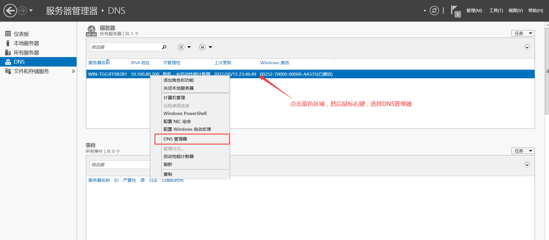 选择服务器管理器左方侧边栏的目录DNS,然后点击右侧的蓝色区域,鼠标右键选择DNS管理器,