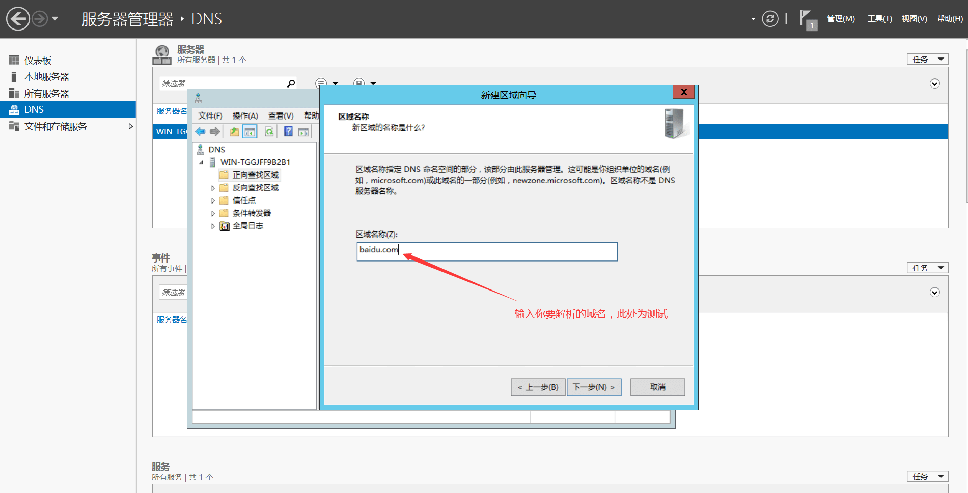 在打开的DNS管理窗口下,选择正向查找区域,然后鼠标右键,新建区域,然后一直点击下一步,填写你要解析的域名,此处以baidu.com为演示,然后一直点击下一步完成即可。