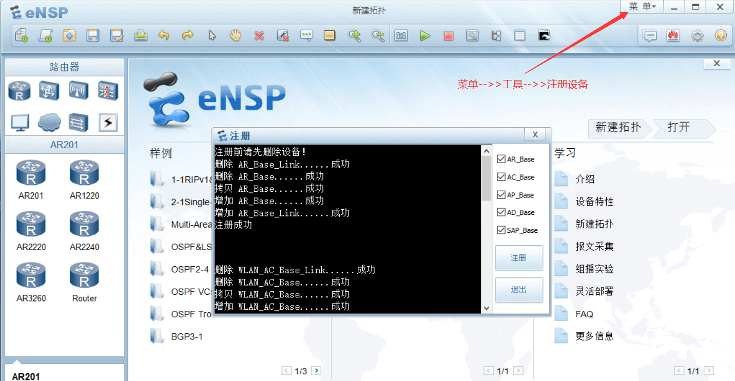 完成上述步骤,打开eNSP,开始注册使用,如下图