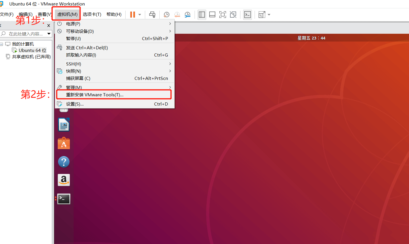 (1)首先启动Ubuntu虚拟机,选择上方的虚拟机中的安装VMware Tools,我之前已经装过了,所以这里显示重新安装。